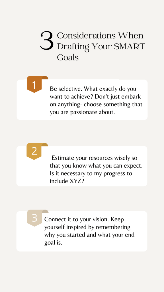 Three key items to keep in mind while you’re drafting your SMART goals include being selective, estimating your resources wisely, and making sure your goal ultimately connects to your overarching vision.