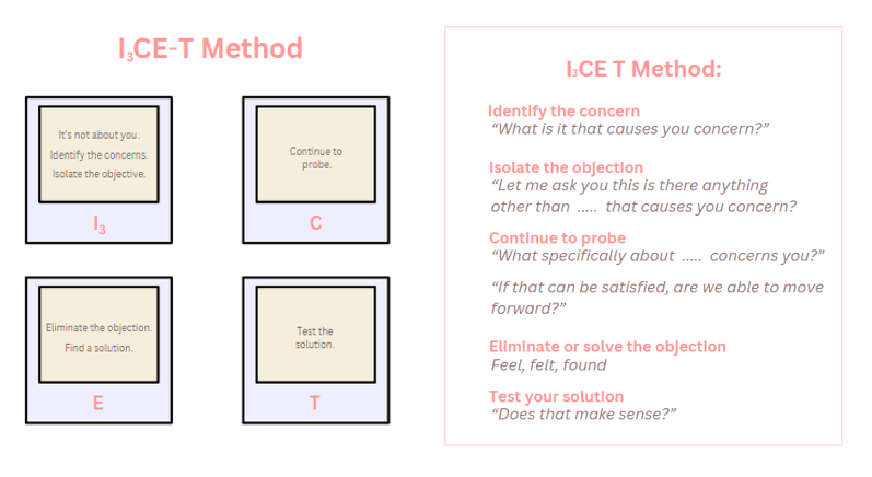 Another, very similar or overlapping method for handling objections using feel, felt, found is known as the I3CE-T Method: 11