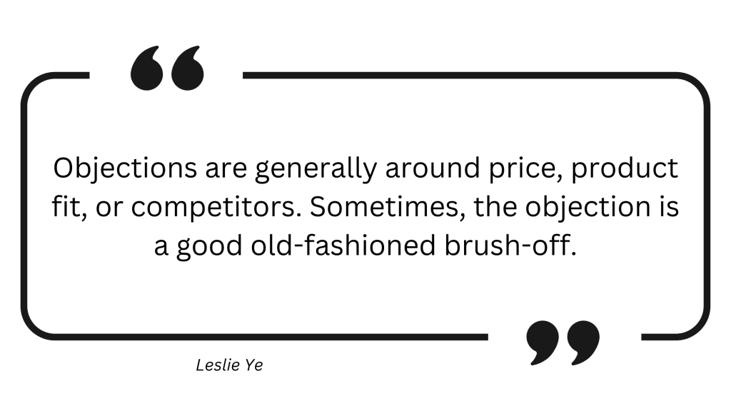 Leslie Ye at HubSpot says that objections based on price might be the most frequent type of objection that you come across, since all purchases come with some degree of financial risk. 13